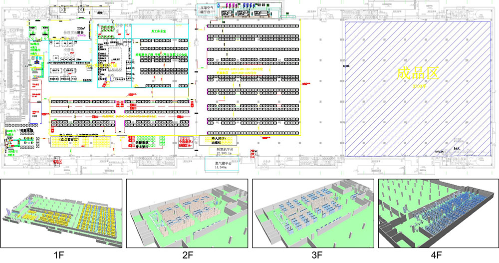 本方案为自动煎煮模式的智慧中药房。按两楼层平面规划,实际产能2000方/8H,设备占地约2000平米;厂房两层面积约2800平米 。