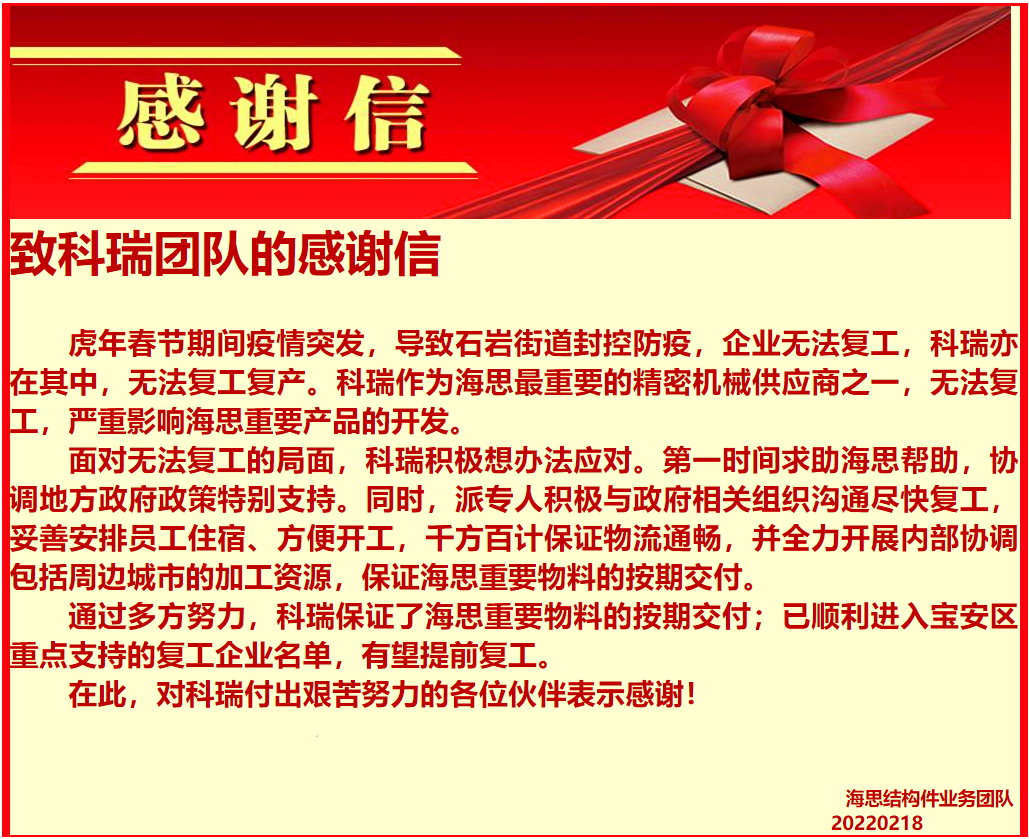 2月18日,科瑞技术精密加工事业部收到客户热情洋溢的感谢信,点名感谢团队5名成员。