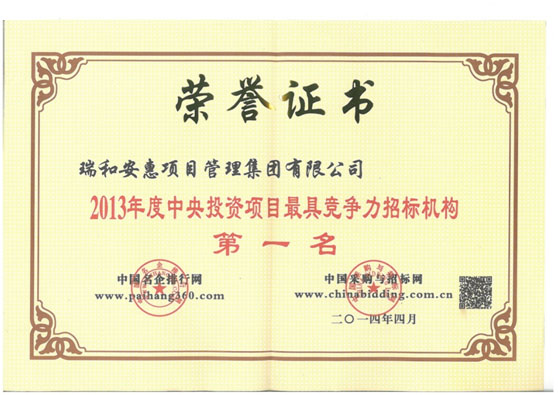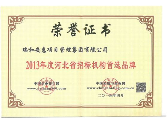 2013年2月,第八届全国招投标领域年度聚焦活动中,我公司积极准备材料申报及网络投票活动,在众博网页版公司全体员工的大力支持下,历时21天的不懈努力,取得了网络票选第一名的好成绩。后经各项审核,最终荣获 “2013年度中央投资项目最具竞争力第一名”、“2013年度河北省招标机构首选品牌”两项殊荣。我公司获得该荣誉是众博网页版公司每位员工辛勤付出的回报。希望大家再接再励,再创佳绩!