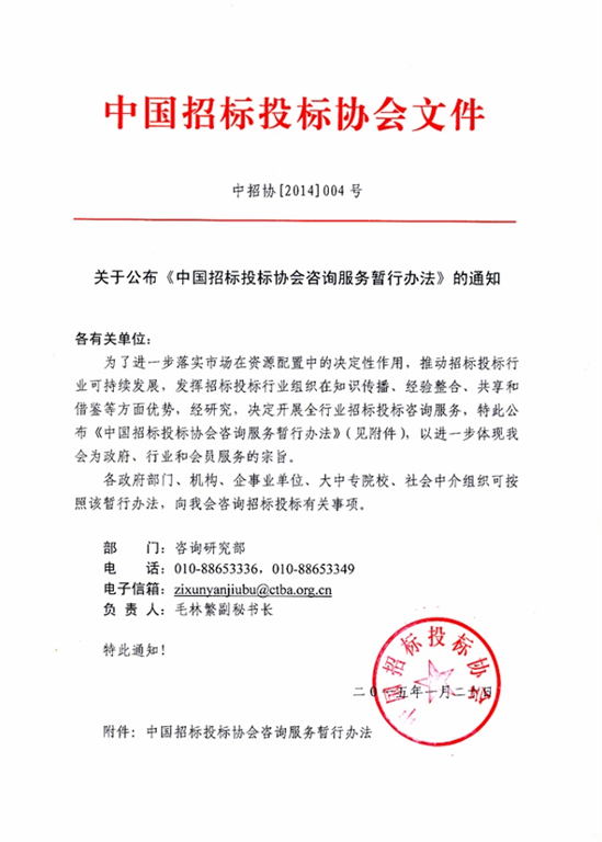 关于公布《中国招标投标协会咨询服务暂行办法》的通知
