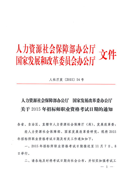 4月13日,人力资源社会保障部办公厅、国家发展改革委办公厅下发《关于2015年招标师职业资格考试日期的通知》(人社厅发[2015]54号),将首次招标师职业资格考试日期推迟至11月7日-8日举行。请广大考生注意时间调整,提前做好考前准备。
