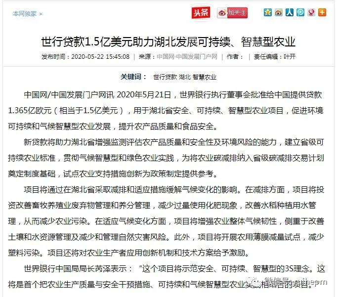 2020年5月21日,世界银行执行董事会批准给中国提供贷款1.5亿美元,用于湖北省安全、可持续、智慧型农业项目,这是世界上首个将农业生产质量与安全干预措施与可持续和气候智慧型农业实践相结合的项目。