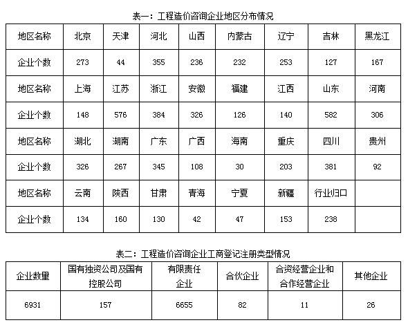 2014年全国共有6931家工程造价咨询企业参加了统计,比上年增长2%。其中,甲级工程造价咨询企业2774家,增长11.6%;乙级工程造价咨询企业4157家,减少3.5%。专营工程造价咨询企业2170家,增长1.8%;兼营工程造价咨询企业4761家,增长2.1%。具体分布见表一、表二: