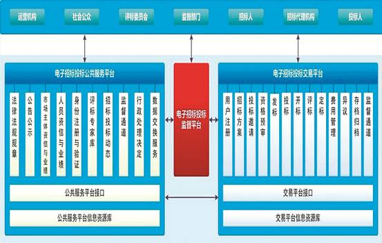 交易平台是以数据电文形式完成招标投标交易活动的信息平台。公共服务平台是满足交易平台之间信息交换、资源共享需要,并为市场主体、行政监督部门和社会公众提供信息服务的平台。行政监督平台是行政监督部门和监察机关在线监督电子招标投标活动的信息平台。