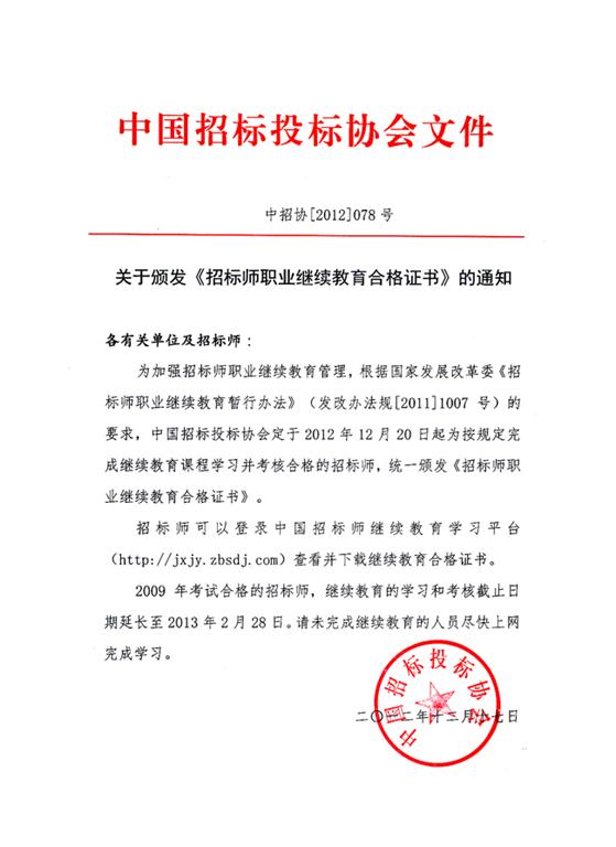 关于颁发《招标师职业继续教育合格证书》的通知