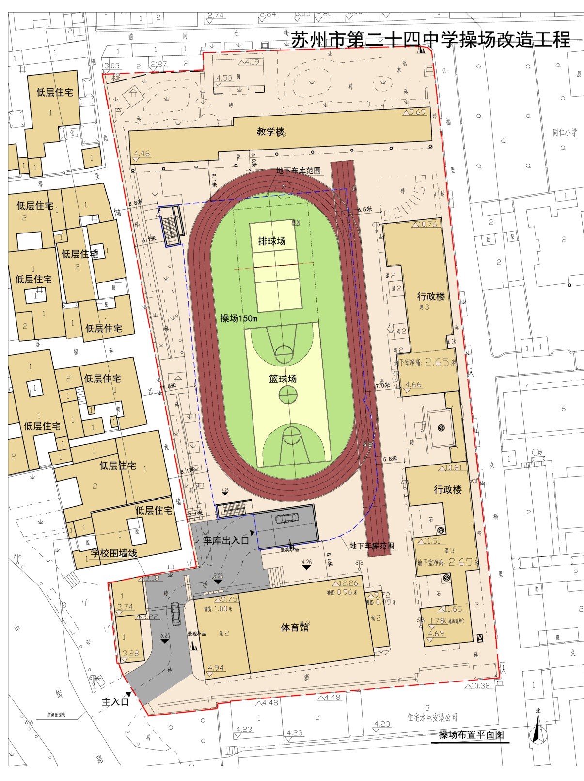 苏州市第二十四中学校操场及塑胶跑道已破旧脱壳,校内路面风化严重,现决定对操场进行整体改造。由于校内场地狭小车辆无处停放,挤占了学生活动空间,给学生、教师的通行带来不便且存在一定的交通安全隐患。为保证学校教育教学需要,保障师生交通安全,改善办学条件,同时不占用校外道路有限的停车资源,学校决定建设一层地下停车库。项目建筑占地面积2347平方米,总建筑面积2401平方米,地下建筑面积2347平方米,地上建筑面积54平方米,停车位约64个。项目总投资约3000万元。项目建设期为1年。